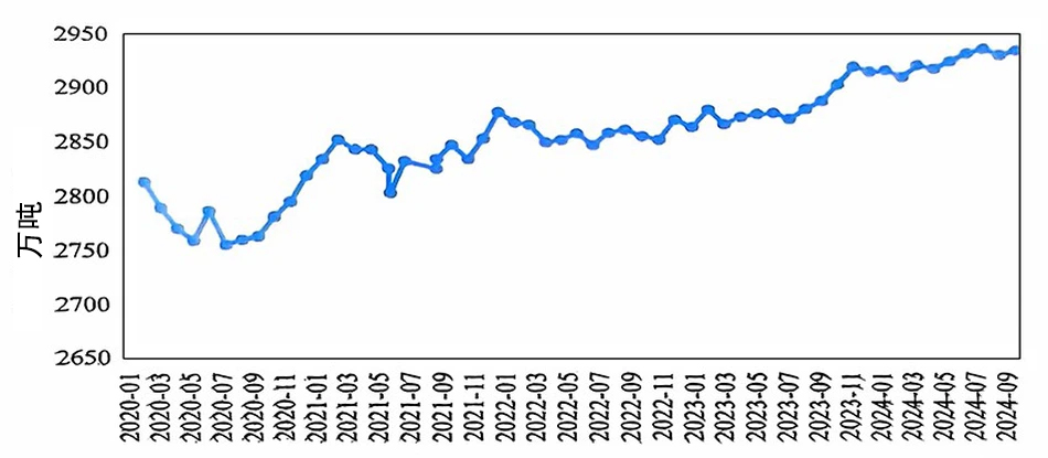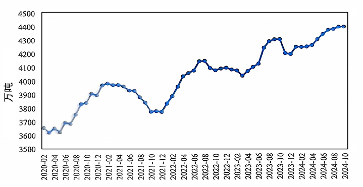 2024年10月,國內(nèi)電解鋁繼續(xù)保持穩(wěn)定生產(chǎn)。10月國內(nèi)電解鋁建成產(chǎn)能4462萬噸/年,運行產(chǎn)能4363萬噸/年,較上月增加12萬噸/年,主要因為四川、貴州等地技改產(chǎn)能逐步復產(chǎn)及新疆置換項目啟槽。本月開工率約98%,為歷史新高。10月份產(chǎn)量為373萬噸,環(huán)比增長3.4%,同比增長2.1%,日均產(chǎn)量12.0萬噸,環(huán)比持平。