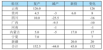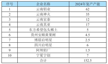 表2-2 2024年中國電解鋁復產(chǎn)產(chǎn)能變動情況(萬噸/年)