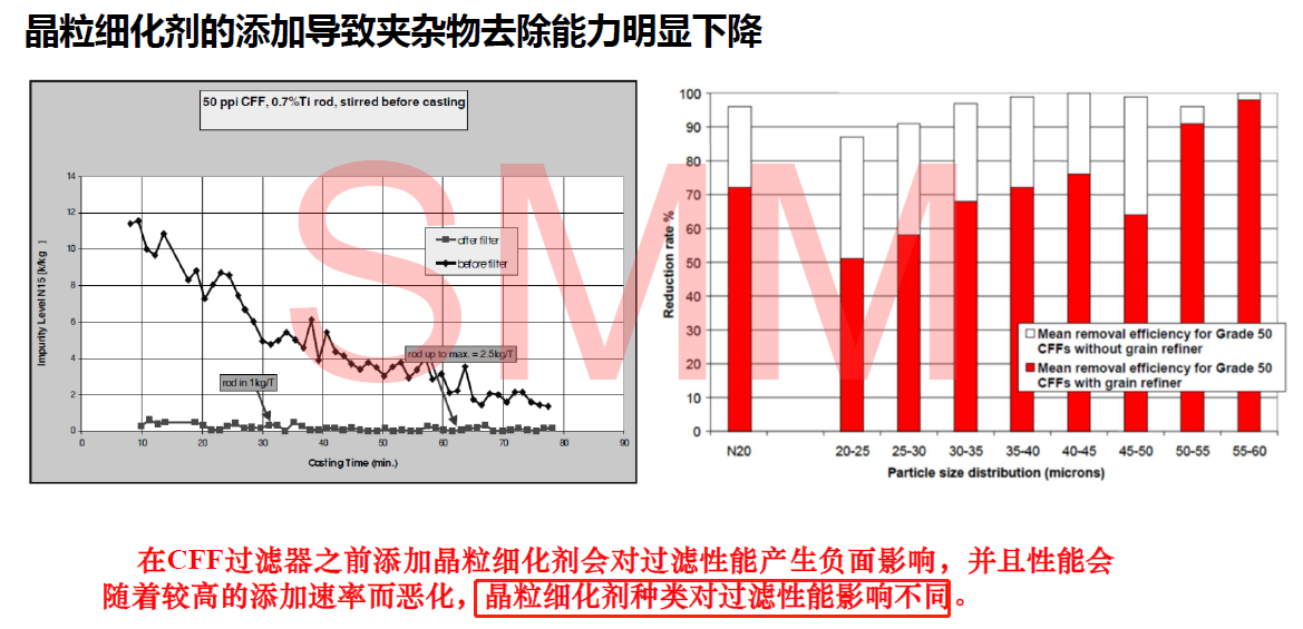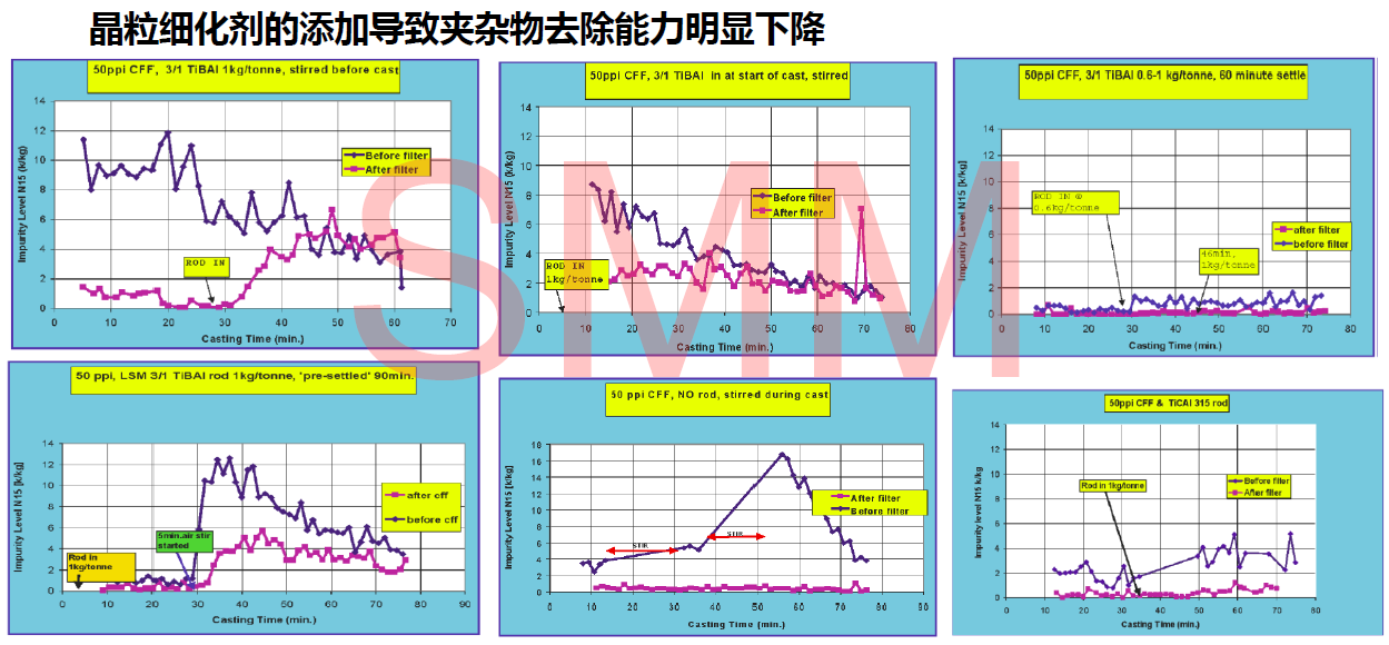 據(jù)丁總調查顯示,常用細化劑會對CFF過濾器的過濾性能產(chǎn)生負面影響,并隨較高的添加速率而惡化,并顯示晶粒細化劑種類對過濾性能影響不同。據(jù)業(yè)內相關試驗調查,鋁鈦碳或因無TiB2,從而減少對CFF過濾器的吸附、堵塞,會大大降低細化劑對過濾器性能的影響。