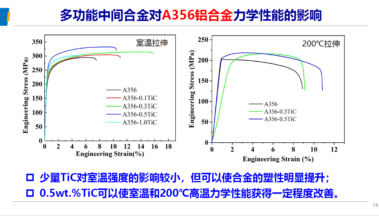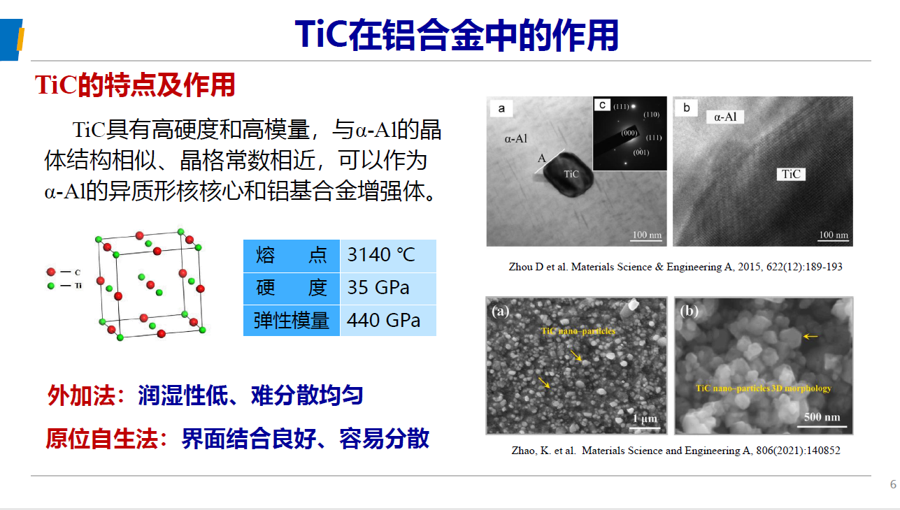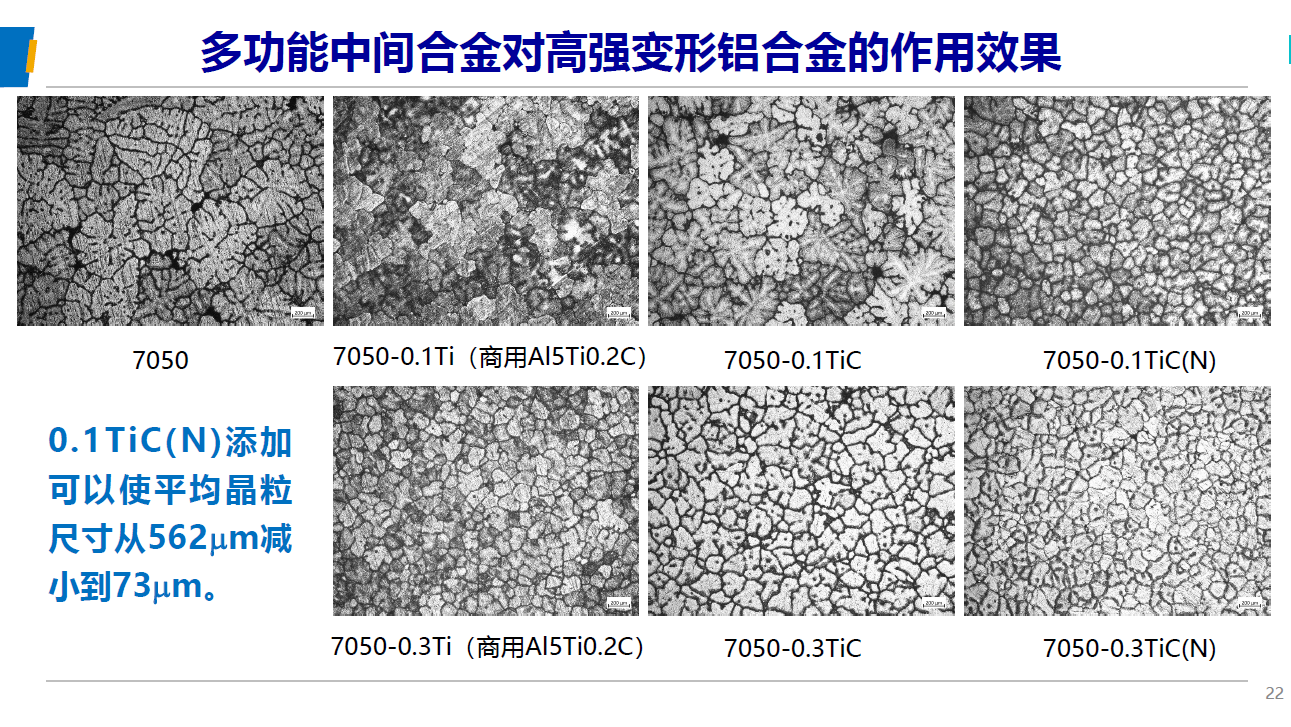 隨著新興的綠色鋁加工聚集區(qū)的建立,新的鋁加工熔鑄產(chǎn)能也隨著電解鋁產(chǎn)能的轉(zhuǎn)移而新興,整體鋁加工熔鑄產(chǎn)能持續(xù)擴(kuò)充,加劇了行業(yè)競(jìng)爭(zhēng)的激烈程度,促動(dòng)了整個(gè)鋁加工行業(yè)產(chǎn)品及技術(shù)的加速升級(jí)和進(jìn)步。本次峰會(huì)北京航空航天大學(xué)云南創(chuàng)新研究院肖文龍博士發(fā)表了題為“Al-TiC(N) 多功能中間合金的制備及應(yīng)用”的報(bào)告,首次系統(tǒng)性的展示了鋁基TiC增強(qiáng)復(fù)合材料,通過晶粒細(xì)化、復(fù)合強(qiáng)化、組織優(yōu)化等途徑,對(duì)于鋁合金基體的常溫、高溫力學(xué)性能的大幅提升。作為公司的戰(zhàn)略儲(chǔ)備技術(shù),我司峰越科技已開始6%TiC含量鋁基碳化鈦顆粒增強(qiáng)材料的工業(yè)化批量生產(chǎn),并成功應(yīng)用于6xxx系合金的強(qiáng)化、2219合金強(qiáng)化、7034焊絲以及增材制造材料的生產(chǎn)。